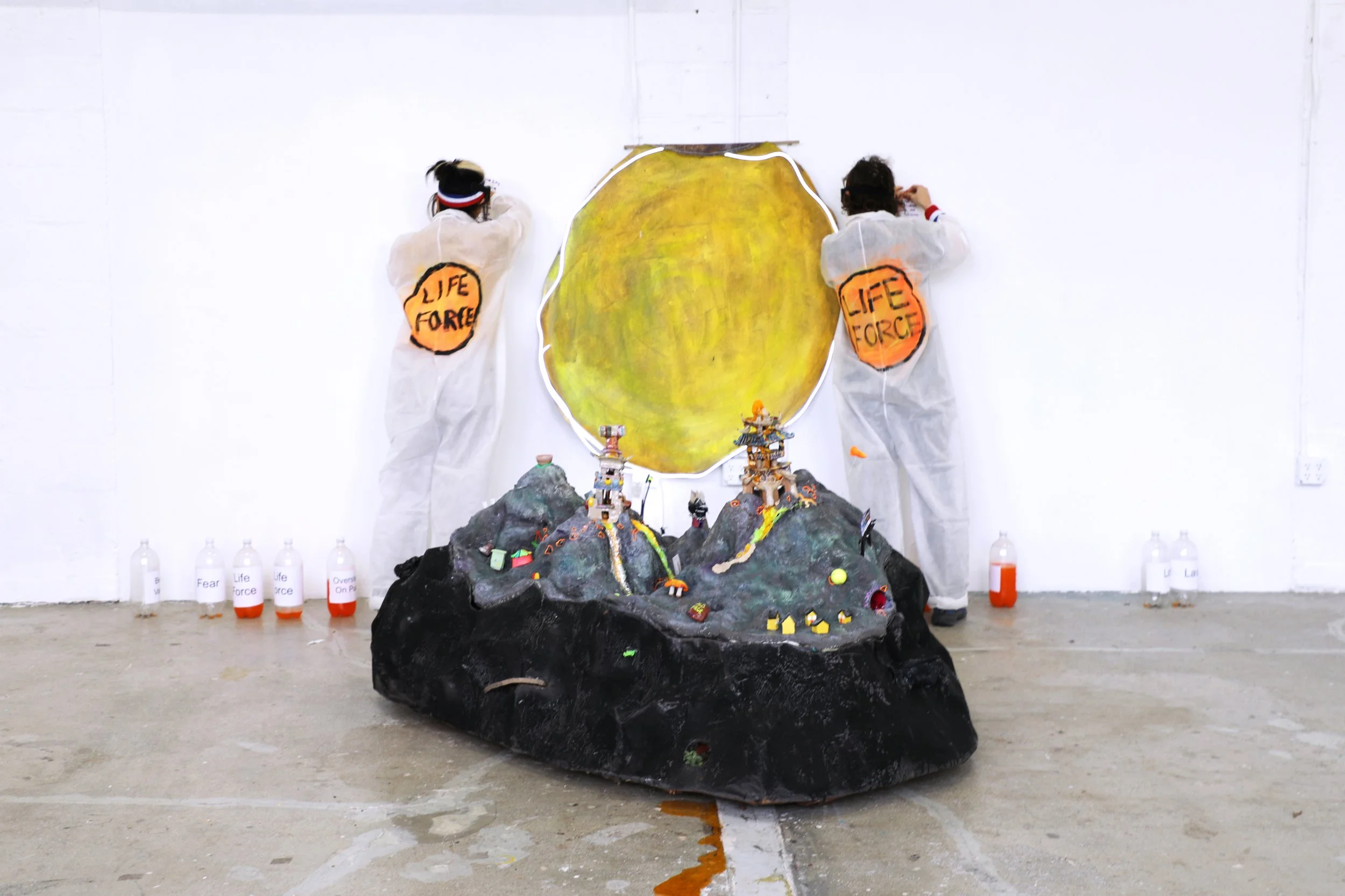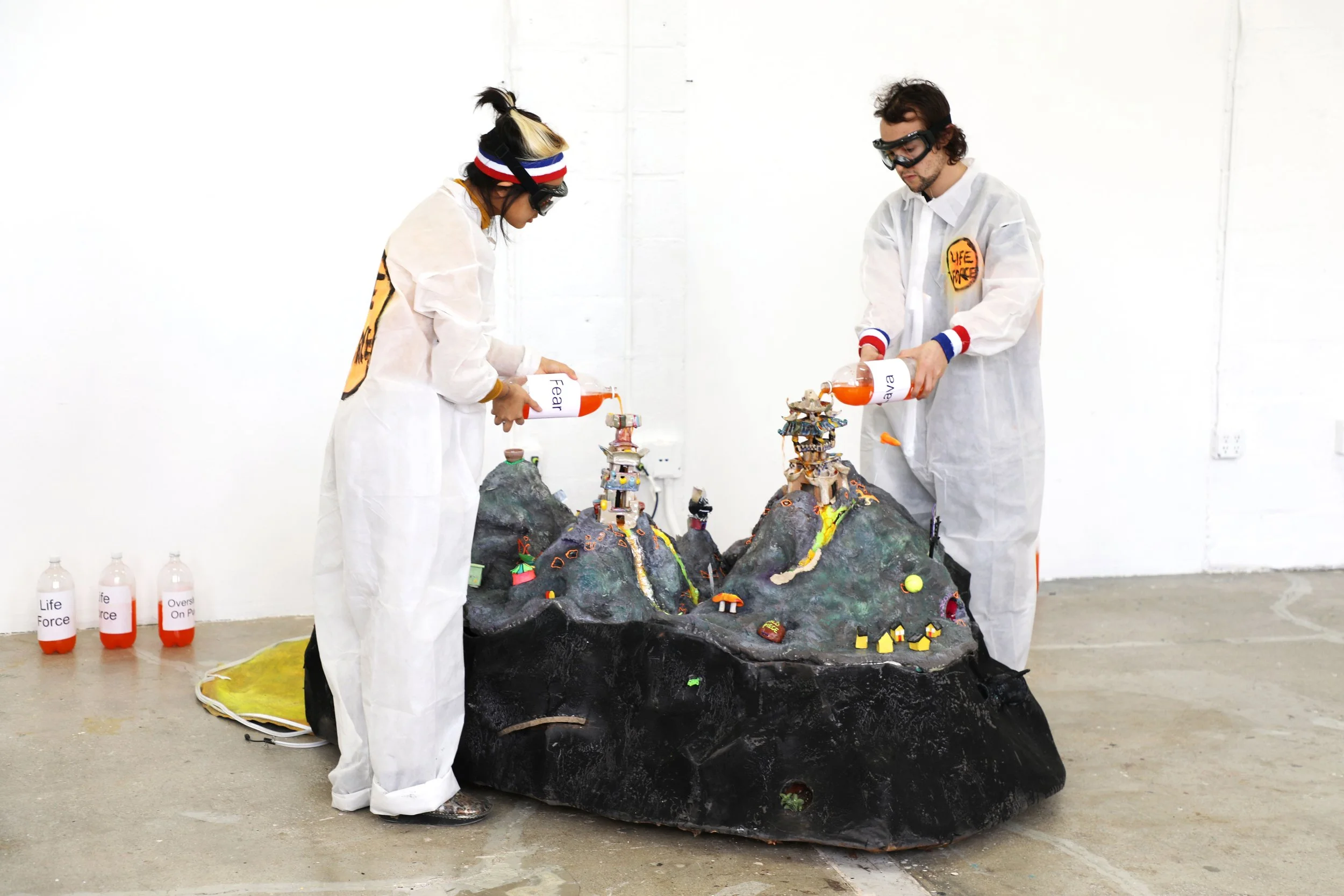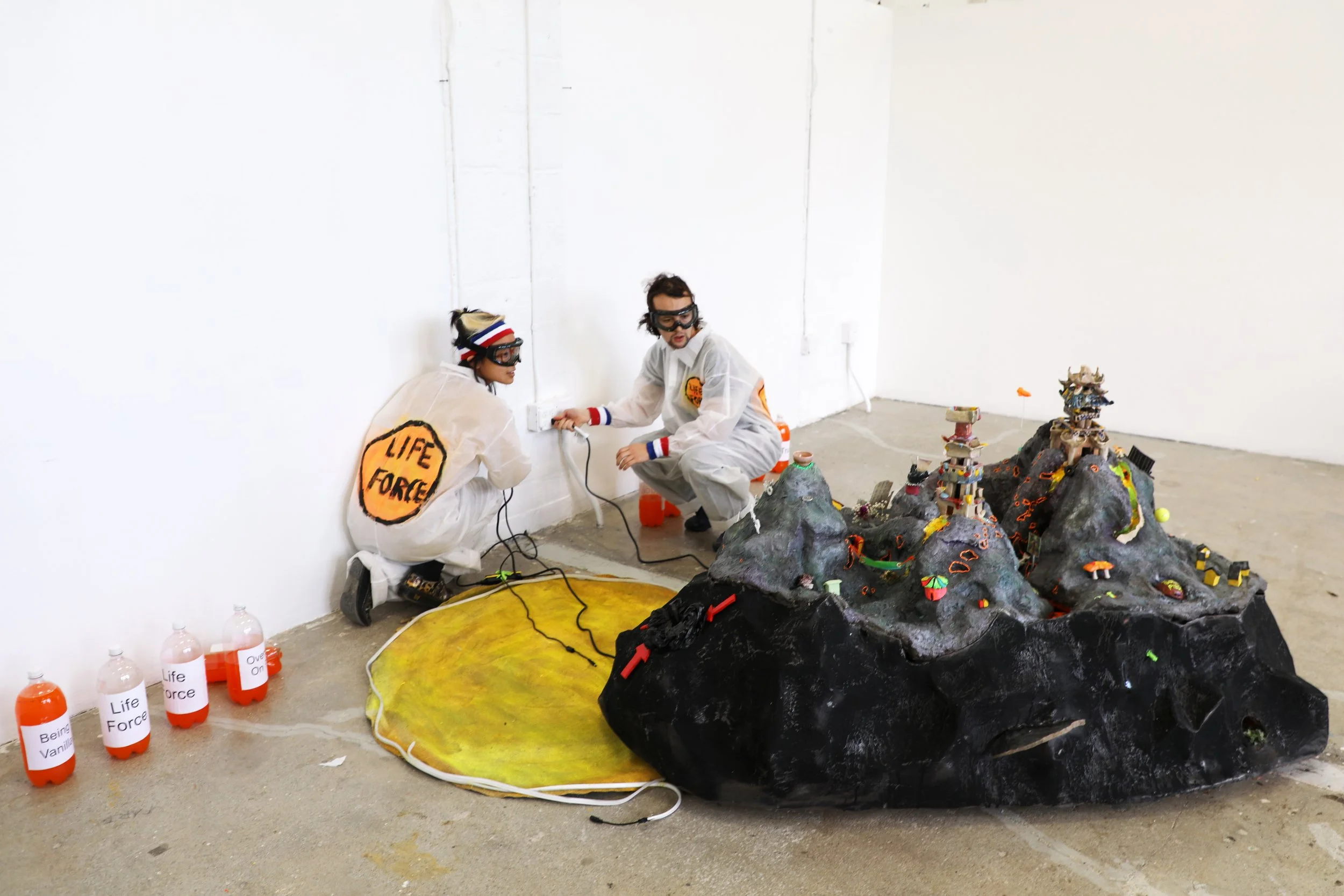 Two figures with suits that read Life Force pour ingredients for a world into two towers, the liquid running down the mountainsides into a crack in the the center. Lava recycling two sides of the same thing to make a mixture, a commonality, a relationship between yourself and an other thing. The orange soda is Love, Fear, Waking up late on purpose, Being Vanilla, it's everything. It is autonomous in its cycle. It’s a life force. They pour until the capacity is satisfied, then they hang up and turn on the sun.