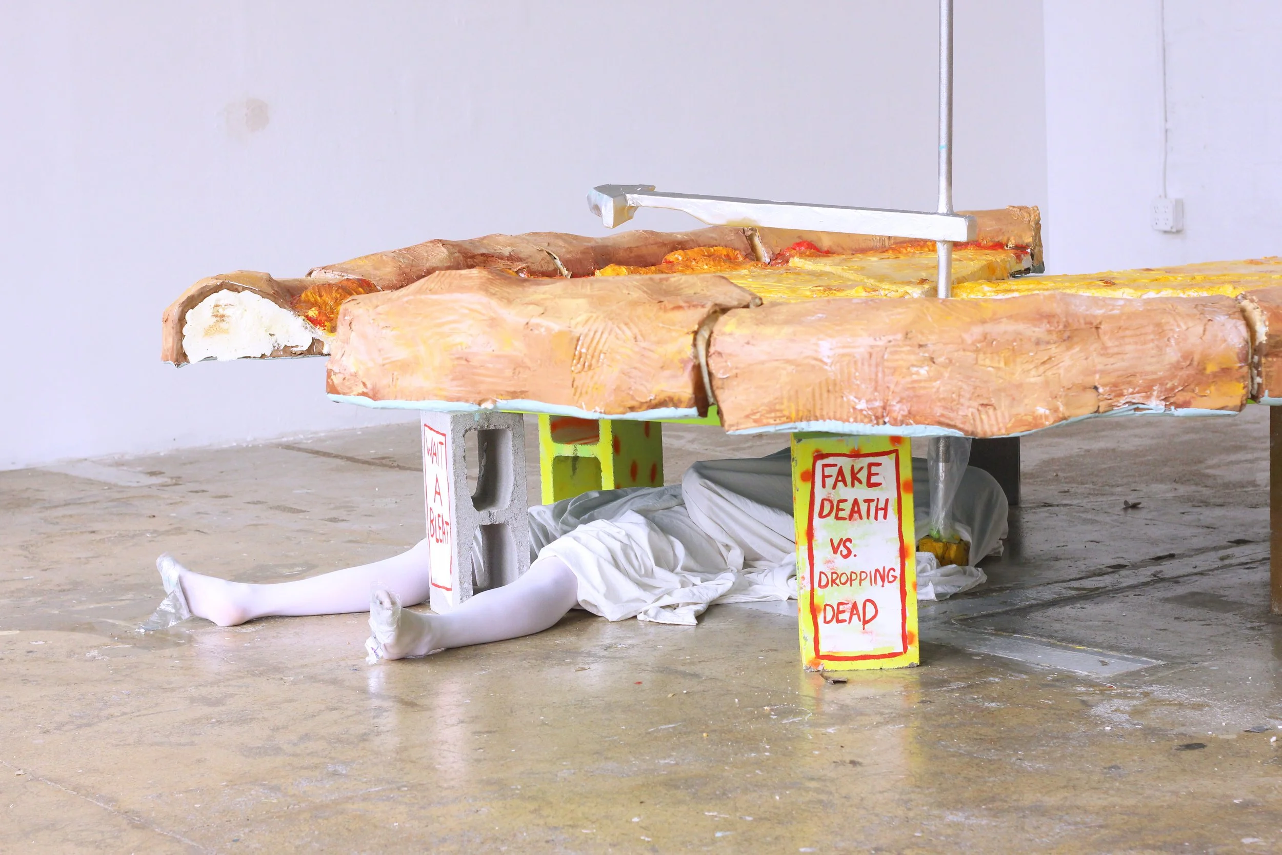 An analog clock that is activated by a ghost laying beneath it and manually turning the hand using a rock. The pizza slices are removable to reveal a reverse clock order with finish line flags. Slices can only be arranged to fit one way. I Love You Always Forever by Donna Lewis is started and stopped by a Ghost DJ over the wall, watching to start and stop the music when the baby face (ie. the hand of the clock) is in motion, inside elapsing time.