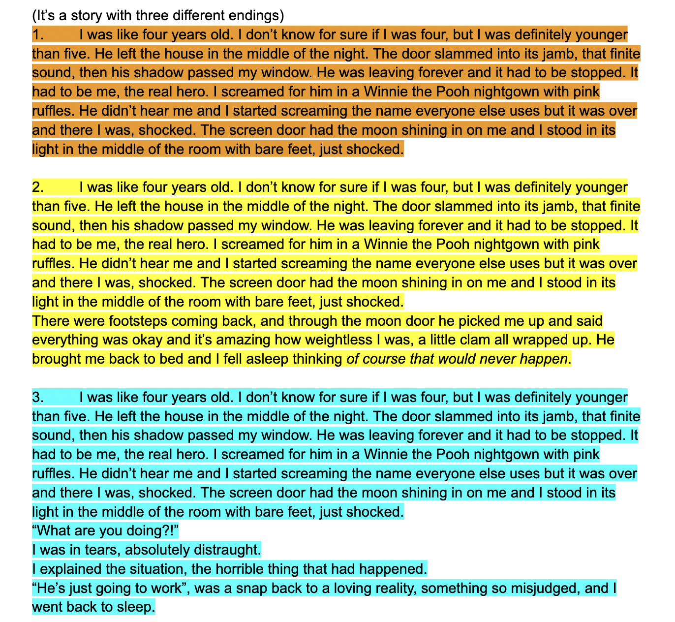 Bop through in both directions in the big feeling of life theater. Enter three times, turn around, then leave three times. Follow the dogs with radioactive hearts. The volcanoes erupting. Looping tricks narrated by my earliest memory I probably made up trying really hard to find the beginning. I want to be really impressive.