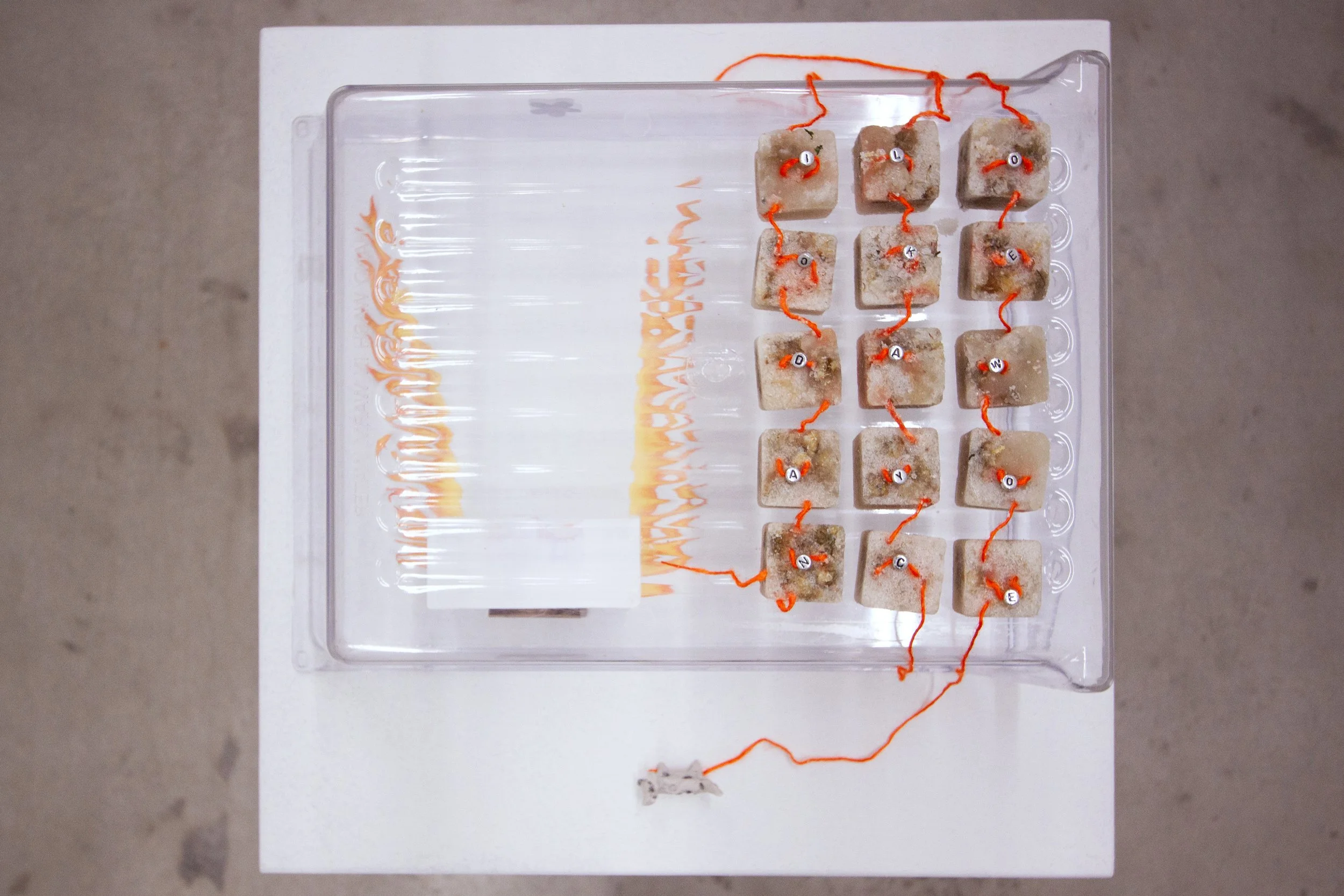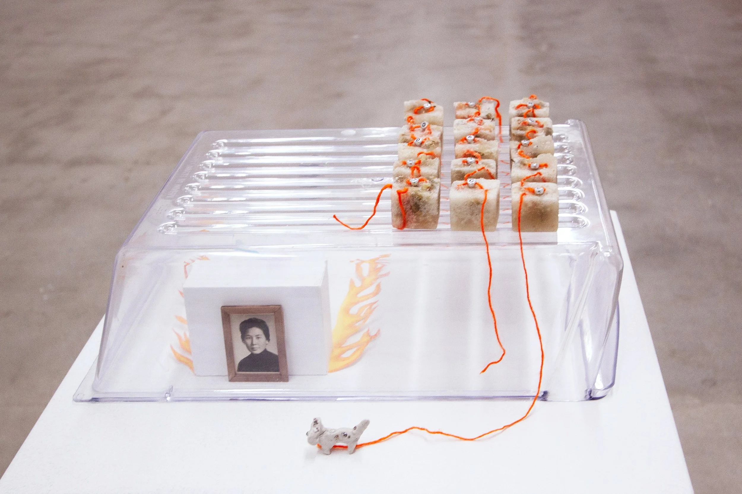 Chrysanthemum (tea), sugar, beads, string, photo of my grandmother, wood, acrylic, paper, clay composite doggy, actual refrigerator drawer from Jordan’s fridge